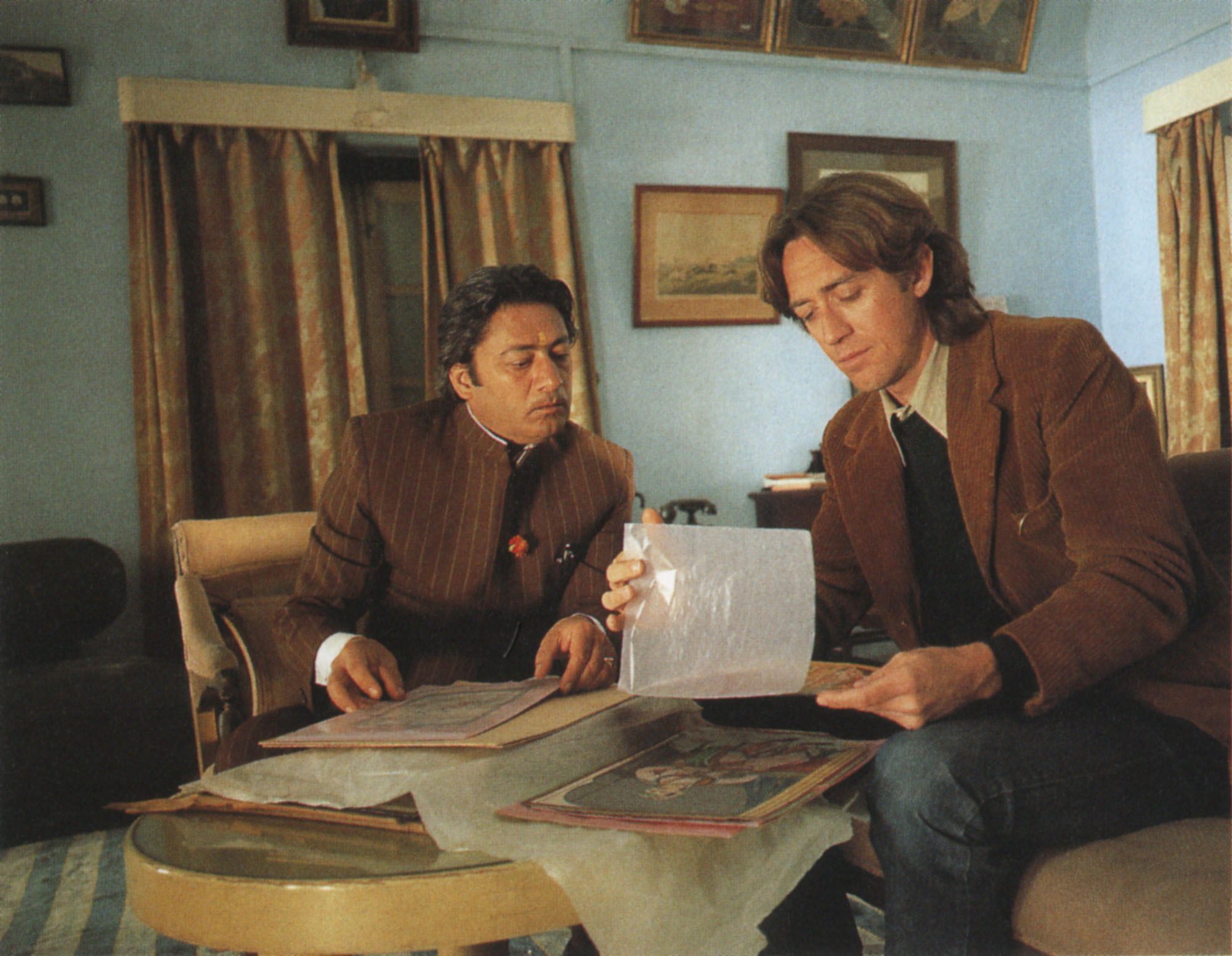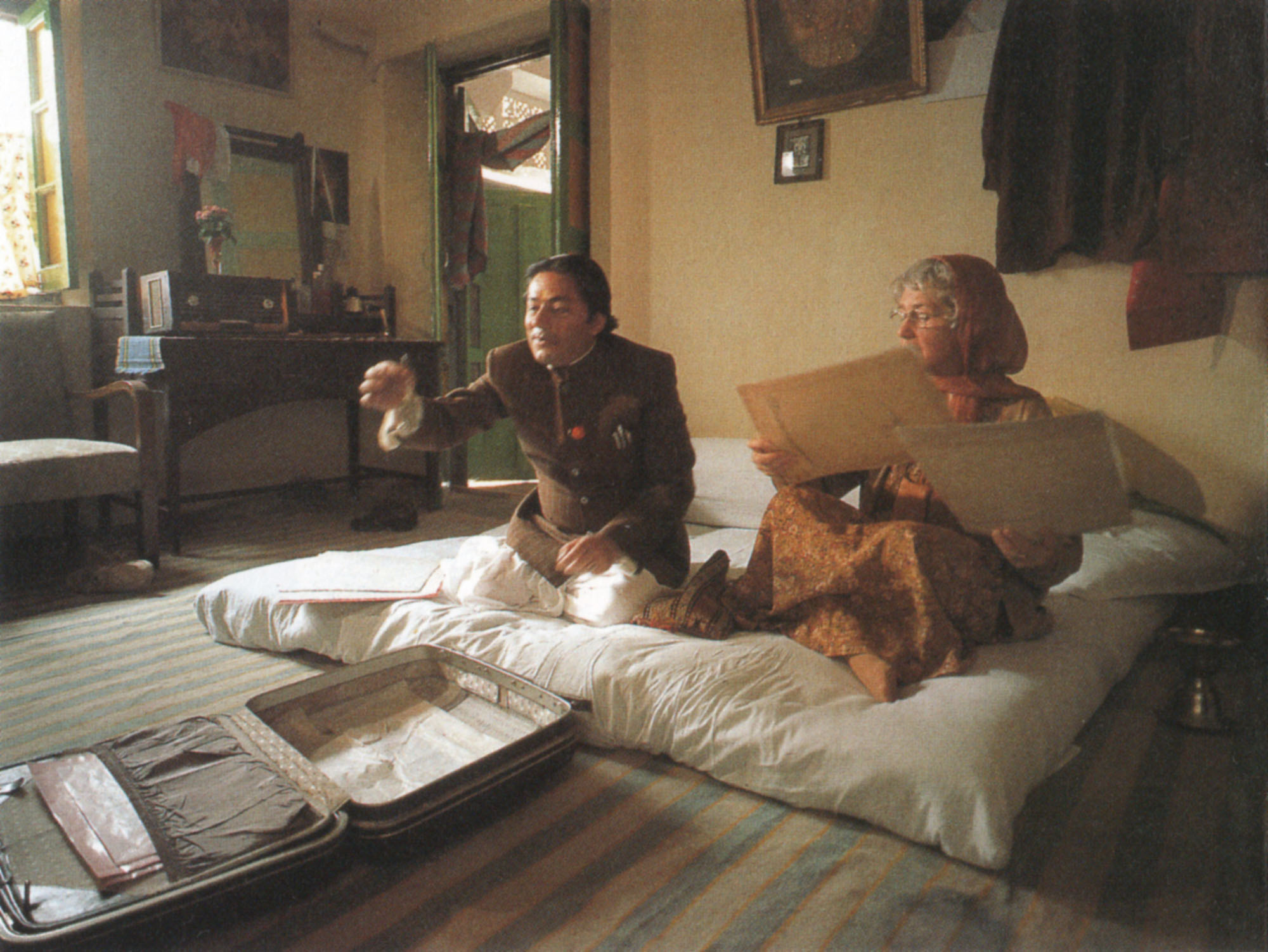 n 1977 the London Weekend Television arts programs called "The South Bank Show" made a proposal through its presenter Melvyn Bragg to Merchant Ivory to make a television film for them. The subject was open, so long as it had an arts connection. Ivory was receptive, and the subject of collecting Indian miniature paintings, an interest of his since The Sword and the Flute, was eventually decided on. The film that resulted, Hullabaloo Over Georgie and Bonnie's Pictures, cost 250,000 pounds to make, with finance coming chiefly from London Weekend Television. The script, written by Jhabvala, working closely with Ivory, proved intractable at many points, and Jhabvala would have withdrawn but for Merchant's insistence that they see it through. Difficulties were increased by the fact that the screenplay was still being written when shooting began in India. "We just kept shooting from these random bits of paper," Ivory explains, "and hoped for the best. We were still trying to figure out the denouement on location at the Umaid Bhawan Palace in Jodhpur." Its improvisatory nature, however, does not show whatever in the finished work, which appeared first on British television and then as a feature film in London that received enthusiastic reviews. The complicated story concerns a legendary collection of Indian miniature paintings locked up in the storeroom of an Indian palace far away in the wilds of the Rajasthani desert. No one has seen these pictures for years, but such is the collection's fame that it has attracted a group of art lovers and fortune seekers who converge simultaneously on the palace. They begin to plot how to make off with it. Lady Gee (played by Peggy Ashcroft) is the determined, high-powered and unprincipled curator of a London museum. She is sure that the pictures belong there, for their own good. A young and inscrutable American collector (Larry Pine) is equally determined to get his hands on them. The Maharaja's restless sister Bonnie (Aparna Sen) wants to whisk them off to Sotheby's and use the money, which she would share with her brother, for a more exciting life somewhere (anywhere) else. The Maharaja (Victor Banerjee) is indifferent -- it seems. He appears only to be interested in the pretty English girl (Jane Booker), that Lady Gee has brought along with her as a companion. In this film of Merchant Ivory about the ownership of art, there is plenty of it on screen, and its ultimate disposition appeals to audiences. The subtleties of the story have been called "Jamesian" by critics: the supposedly innocent or unworldly characters turn out to be wily as foxes, while the greedy and high-handed ones turn out in the end to be unexpectedly generous and philosophical minded.